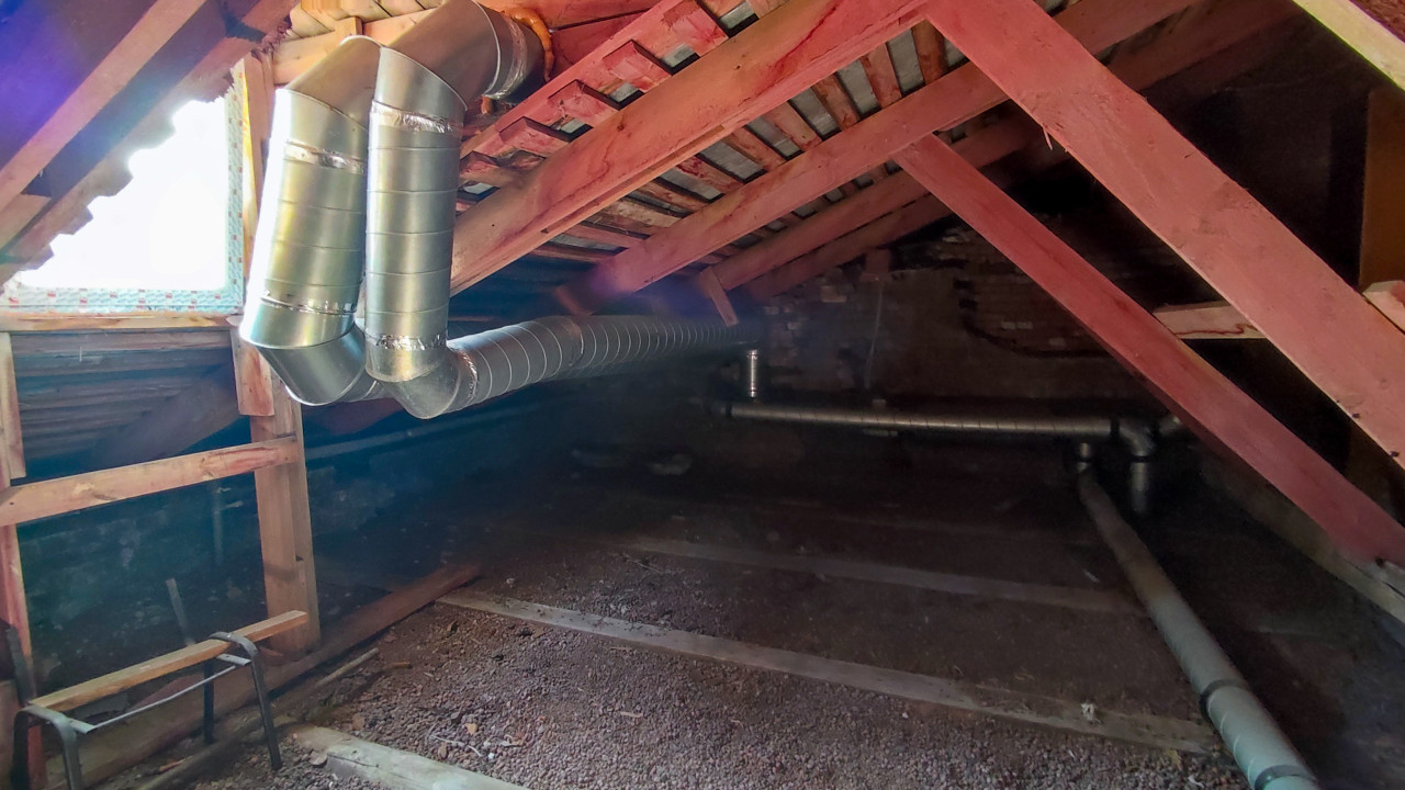 На фото изображён чердак здания с деревянными стропильными конструкциями и металлическими вентиляционными трубами. Крыша выполнена из металлических листов, а балки окрашены в красный цвет. Слева виден проём с естественным освещением. На полу заметны строительные материалы и мусор. Снимок демонстрирует инженерные системы здания и может быть использован в материалах, посвящённых вентиляции, реконструкции и внутренним техническим решениям.