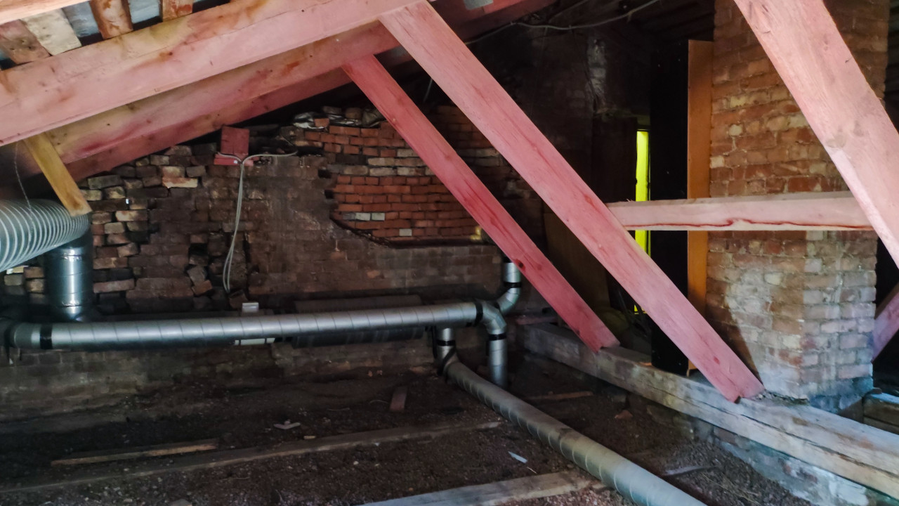 На фото запечатлено чердачное пространство с деревянными стропильными конструкциями и металлическими вентиляционными трубами. В центре видна кирпичная стена с частичными разрушениями и неровностями кладки. На полу рассыпан керамзит и заметны элементы строительного мусора. Конструкции стропил окрашены в красный цвет. Снимок фиксирует текущее состояние инженерных систем и строительных конструкций и может быть использован в материалах о реставрации и ремонте зданий.