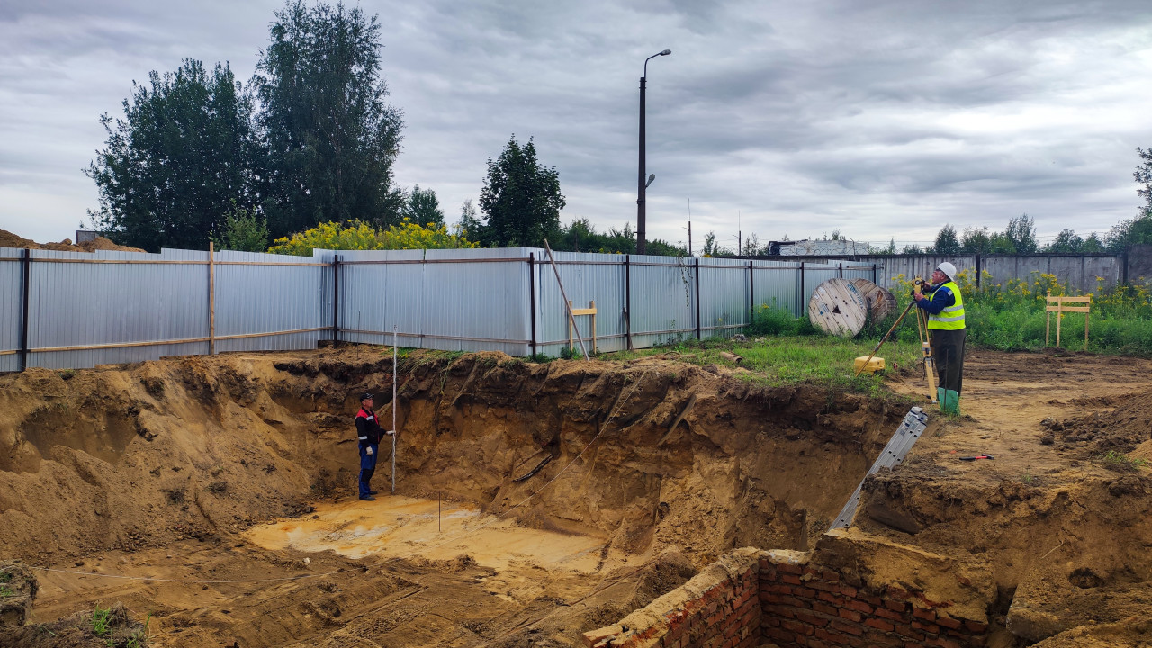 Геодезические измерения в котловане на стройплощадке