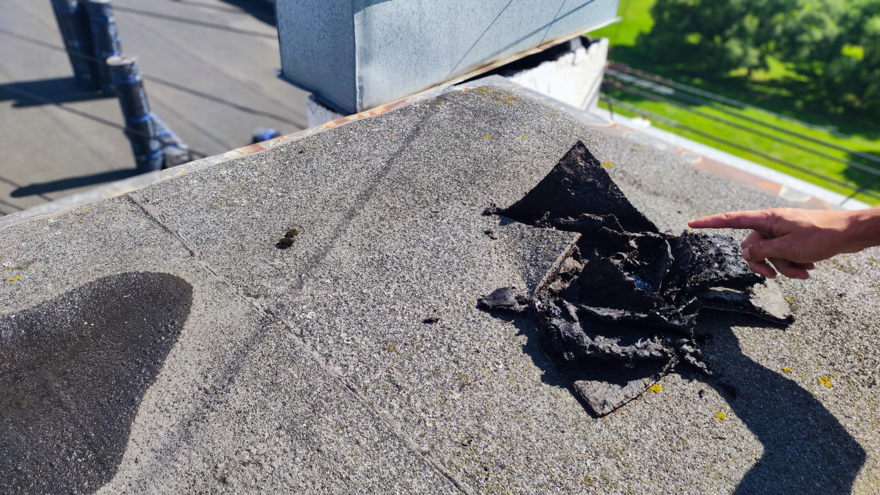 дефект повреждение трещины разрушение строительные дефекты техническое состояние крыша кровельное покрытие гидроизоляция ремонт строение здание многоэтажка жилой дом асфальтовая крыша строительные материалы разрушенный материал износ повреждённая поверхность дефект крыши человек указывает рука лето солнце техническая зона техобслуживание архитектура урбанистика жилой массив город зеленьПохожие фотографии