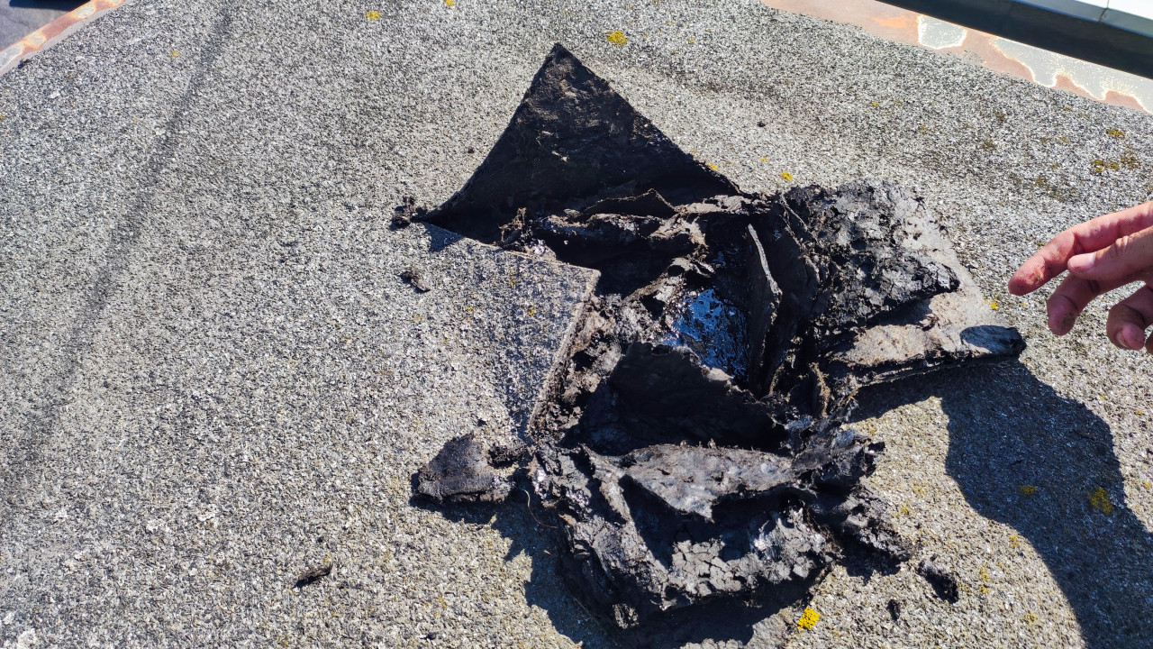 дефект повреждение трещины разрушение строительные дефекты техническое состояние крыша гидроизоляция кровельный материал обугленный материал крыша дома разрушение покрытия ремонт кровля асфальтовая крыша износ плоская крыша человек указывает рука лето солнце город обследование крыши техосмотр архитектура жилое здание урбанистика проблемы строительства дефекты эксплуатацииПохожие фотографии