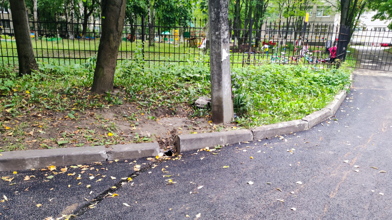Ливнеприёмный жёлоб вдоль бордюра на повороте дороги