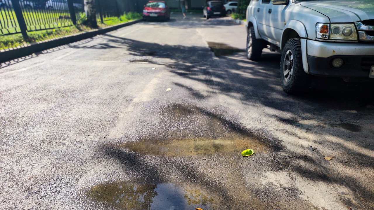 На фотографии изображён участок дворовой дороги с асфальтовым покрытием, на поверхности которого образовались лужи после дождя. На переднем плане видна вода, отражающая небо и деревья, справа припаркован автомобиль. Асфальт имеет следы недавних ремонтных работ, местами заметна разная текстура покрытия. Снимок иллюстрирует недостатки в системе водоотведения и может быть использован в материалах о контроле качества ремонта дорог и благоустройстве территории.