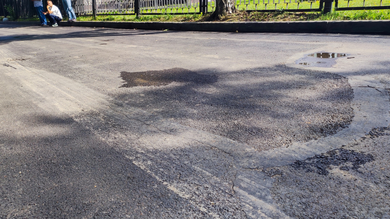 На изображении показан фрагмент дворовой дороги с асфальтовым покрытием, на поверхности которого видны лужи и следы влаги. На заднем плане несколько человек оценивают состояние покрытия, а вдоль дороги тянется металлическое ограждение и зелёные деревья. Асфальт местами имеет следы недавних ремонтных работ и участки различной текстуры. Снимок фиксирует результаты ремонта дорожного полотна и подходит для использования в материалах о контроле качества асфальтирования.