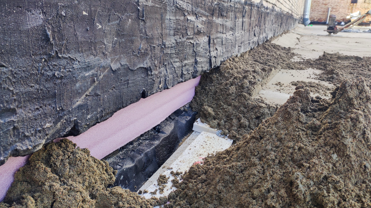 Утеплитель и песчаная засыпка у кирпичной стены здания