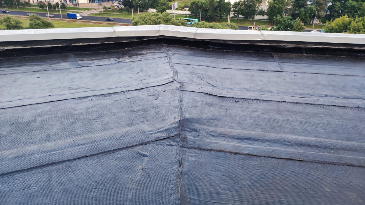 На фотографии показан участок крыши с уложенным рулонным гидроизоляционным материалом в месте стыка. Видны нахлёсты полотен и герметизация соединений. На заднем плане за парапетом различимы деревья, дорога и движущийся транспорт. Снимок иллюстрирует особенности устройства кровли и контроль качества укладки в зонах сопряжения.