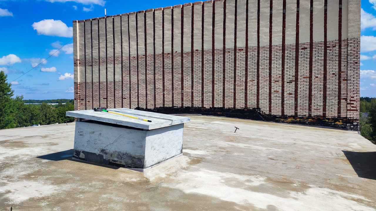 Плоская крыша с вентиляционным коробом и кирпичной стеной