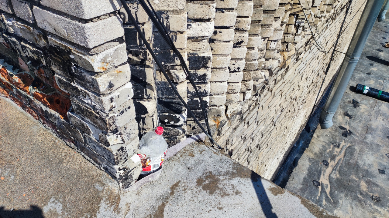 На снимке показан фрагмент кирпичной стены здания на крыше, где заметны разрушенные и обветшавшие участки кладки. По поверхности стены проходят закреплённые кабели, рядом установлен пластиковый бутылочный контейнер. На переднем плане различима бетонная поверхность крыши, а также система водостоков. Фото фиксирует текущее состояние конструкции и может использоваться для оценки необходимости ремонтных работ.