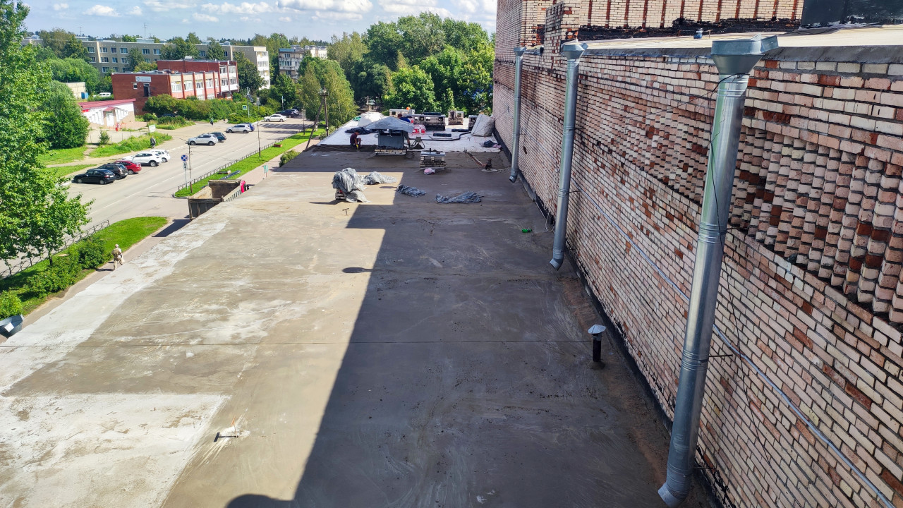 На фотографии изображена плоская крыша крупного кирпичного здания в процессе ремонтных работ. Поверхность крыши частично очищена и покрыта новым слоем гидроизоляционного материала. В кадре заметны рабочие, занятые ремонтом, и строительные материалы, размещенные вдоль стены. На фасаде видны новые металлические водосточные трубы, закрепленные по периметру. Внизу можно различить улицу с припаркованными автомобилями и прохожими. Снимок фиксирует этап восстановления кровли здания и отражает процесс проведения строительных работ.