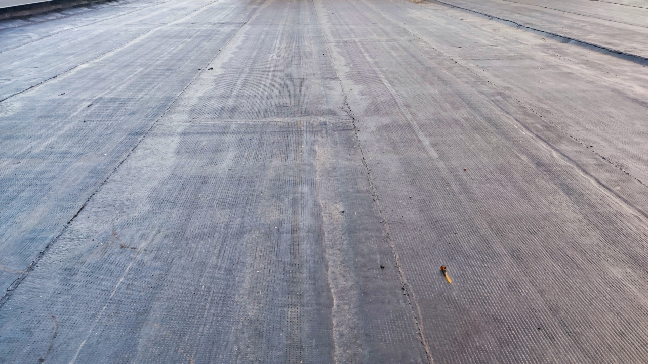 На фото крупным планом показан фрагмент крыши, покрытый рулонным битумно-полимерным материалом. На поверхности заметны стыки полотен и следы укладки, что свидетельствует о недавнем ремонте. Фотография фиксирует фактуру и состояние кровельного покрытия. Такой кадр может быть использован для документации строительных работ, контроля качества укладки гидроизоляции и иллюстрации материалов по строительству.