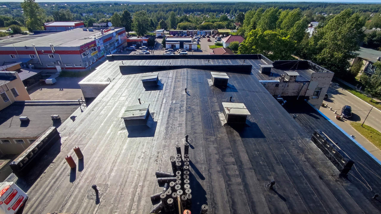 Общий вид плоской крыши здания с уложенной рулонной кровлей