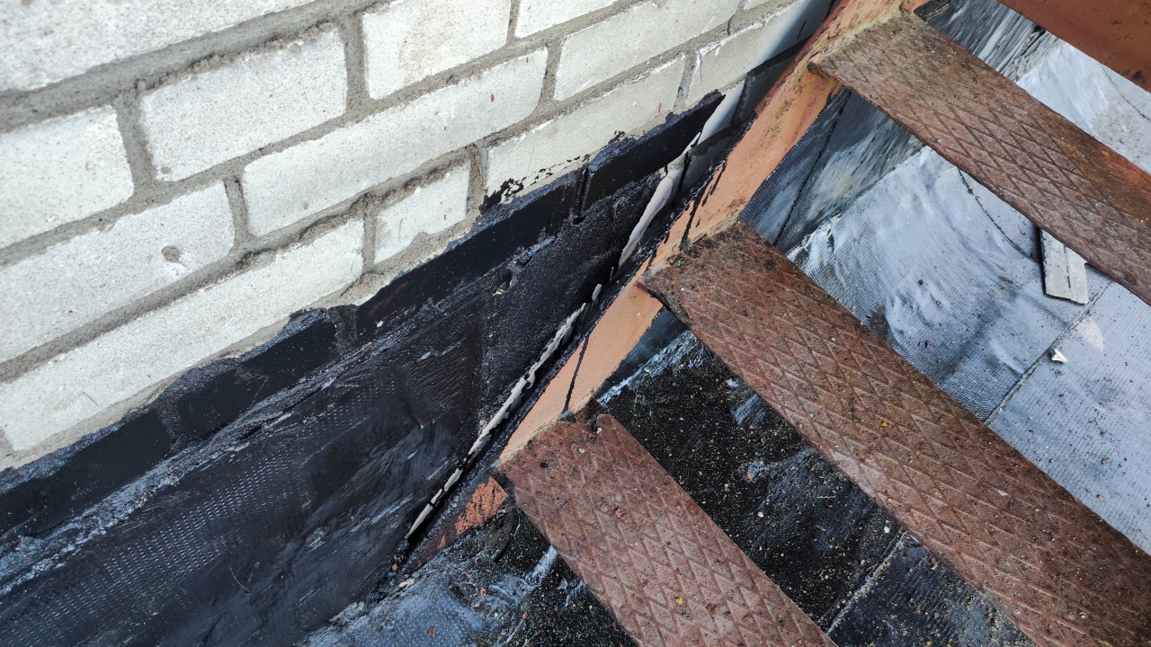 На фото показан участок примыкания рулонной кровли к кирпичной стене здания в месте установки металлической лестницы. Видны элементы гидроизоляционного слоя черного цвета, уложенного по основанию стены, а также ржавые ступени лестницы с рифленым покрытием. Такое решение применяется для герметичности конструкции и защиты от проникновения влаги. Снимок можно использовать в материалах о строительстве, ремонте кровельных покрытий и узлах сопряжения инженерных элементов.