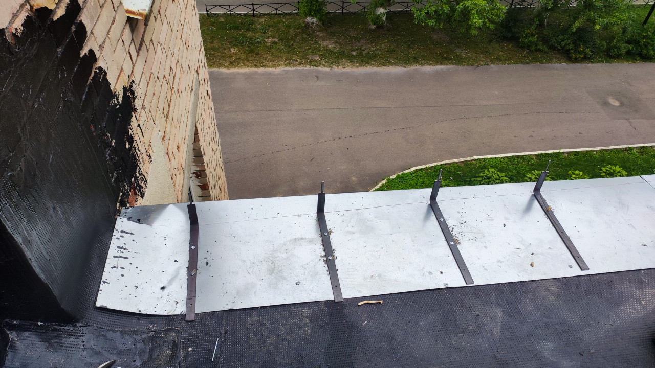 Фотография показывает участок кровли многоквартирного здания с установленными металлическими элементами карниза и проведенными работами по гидроизоляции. На кирпичной стене заметны следы нанесенного изоляционного материала. В нижней части кадра расположена металлическая планка с крепежами. На заднем плане видна асфальтированная дорога и зеленые насаждения. Снимок может использоваться в материалах о ремонте крыш, строительстве и эксплуатации зданий.
