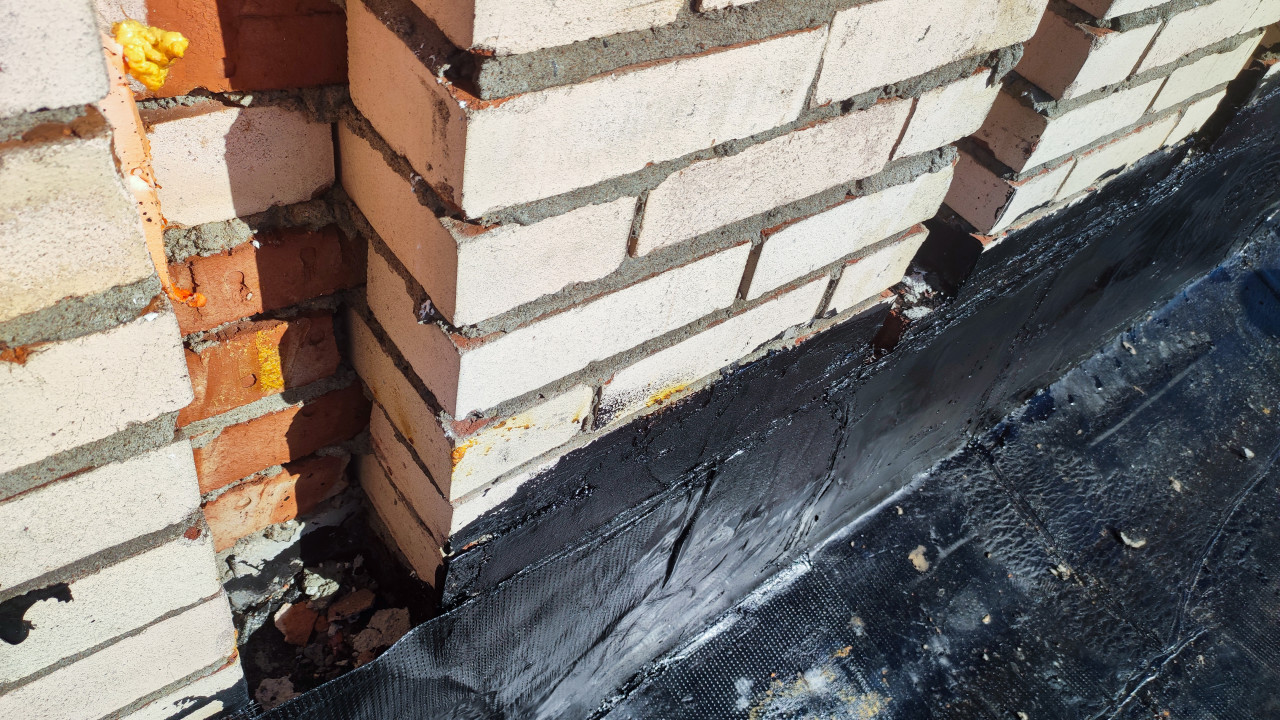 На фото представлен участок примыкания рулонной кровли к кирпичной стене. Видны красные и светлые кирпичи, а также следы строительной пены и свежего раствора между швами. Нижняя часть стены обработана гидроизоляционным материалом черного цвета, предотвращающим протечки. Такое решение важно для герметичности крыши и защиты конструкции от проникновения влаги. Изображение можно использовать в материалах о строительстве, ремонте и гидроизоляции зданий.