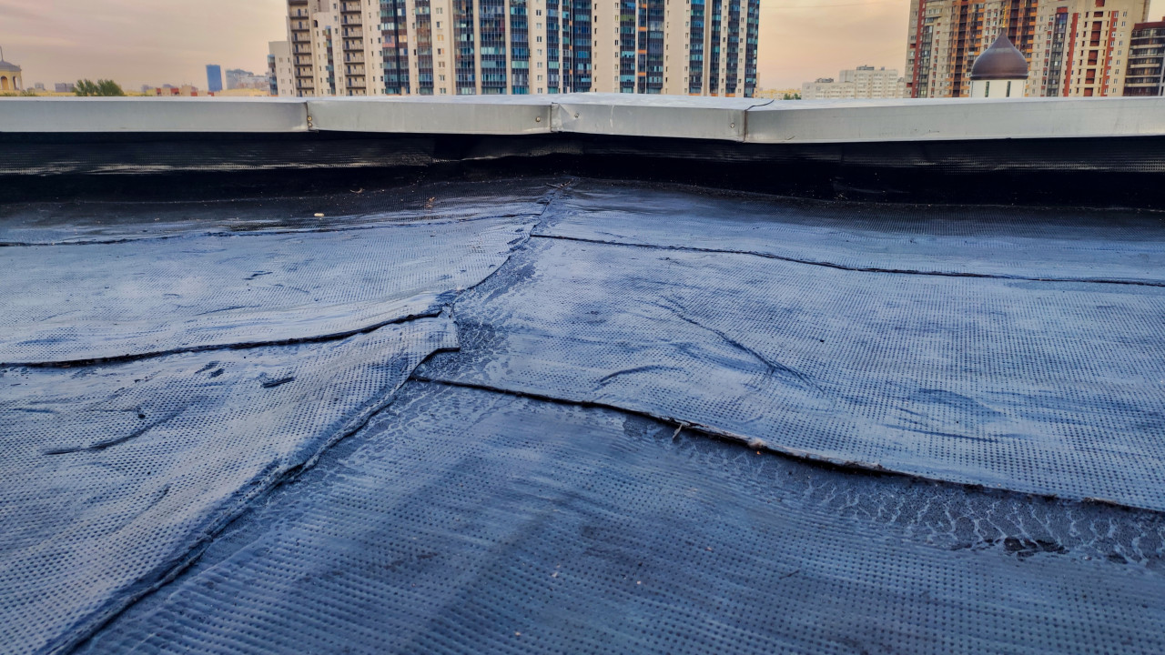 Фотография крупным планом демонстрирует стыки рулонного гидроизоляционного материала на крыше многоэтажного здания. Видны линии нахлёста и неровности покрытия, на заднем плане различимы фасады современных жилых домов. Снимок используется для иллюстрации контроля качества ремонта кровли и особенностей укладки рулонных материалов.