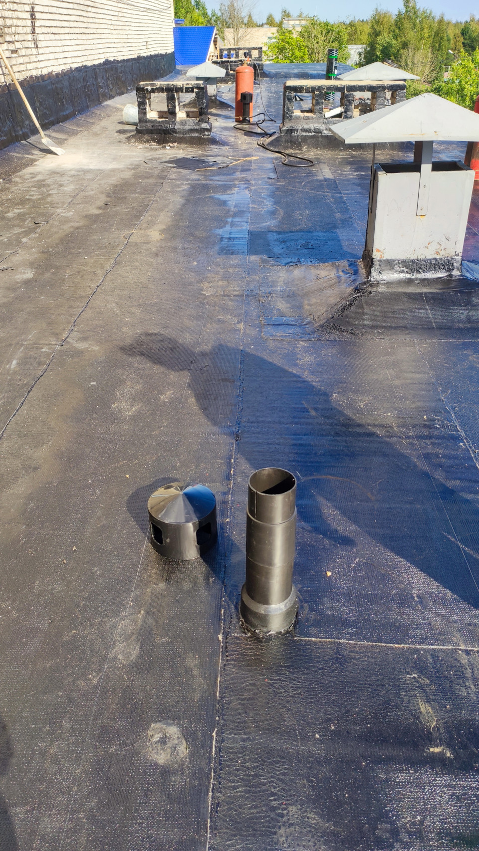 На фото показана поверхность плоской крыши с новым рулонным покрытием, на которой установлены вентиляционные трубы. Рядом лежит съёмная крышка вентиляционного канала, а также строительный инвентарь. Сцена отражает этап монтажных работ по организации вентиляции на крыше многоквартирного дома. Фотография может быть использована в строительной документации, отчётах и публикациях о ремонте кровли.