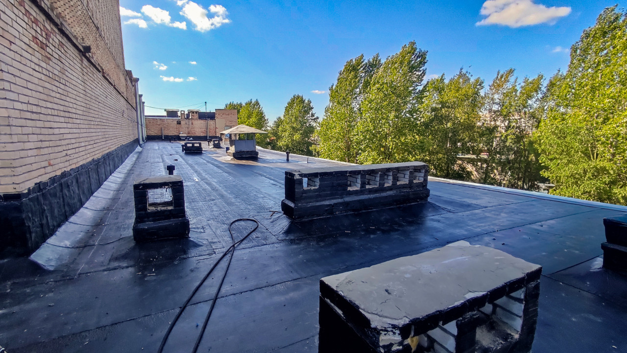 Фотография демонстрирует плоскую крышу кирпичного здания с уложенным рулонным гидроизоляционным покрытием. На поверхности расположены вентиляционные выходы и кирпичные конструкции, видны остатки строительных материалов. Вдоль стены тянется пожарная лестница. На заднем плане заметны деревья и соседняя застройка. Снимок фиксирует завершающий этап строительных работ и может использоваться для тем, связанных с ремонтом и эксплуатацией зданий.
