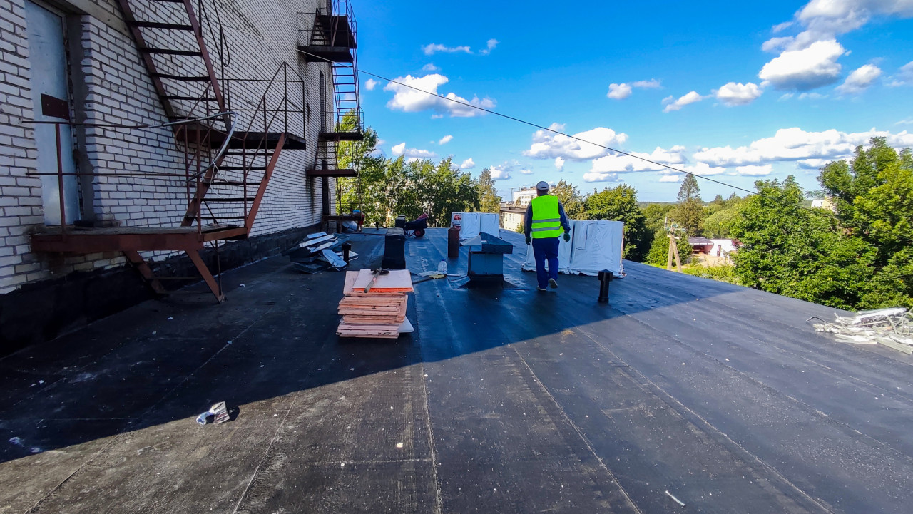 крыша ремонт крыши крыша здания износ кровельные работы ремонт кровли повреждения крыши кровля кровельное покрытие крыша дома плоская крыша рулонная кровля гидроизоляция Технониколь утеплитель строительные материалы кирпичное здание пожарная лестница рабочие на крыше техника безопасности строительство ремонт зданий городская застройка наружные работы кровельщики строительный процесс промышленное здание крыши домов монтаж кровли капитальный ремонт ремонтное оборудование фасад зданияПохожие фотографии
