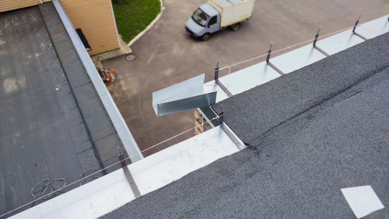 На фотографии показан участок кромки крыши с уложенным рулонным материалом и установленным металлическим элементом водоотвода. Конструкция закреплена на металлических кронштейнах, рядом натянут трос для снегозадержания. Внизу видна территория с асфальтовым покрытием и стоящей машиной. Фото демонстрирует элементы кровельной системы и меры по отводу воды и безопасности эксплуатации крыши. Такой снимок применим в материалах о строительстве и ремонте кровельных покрытий.