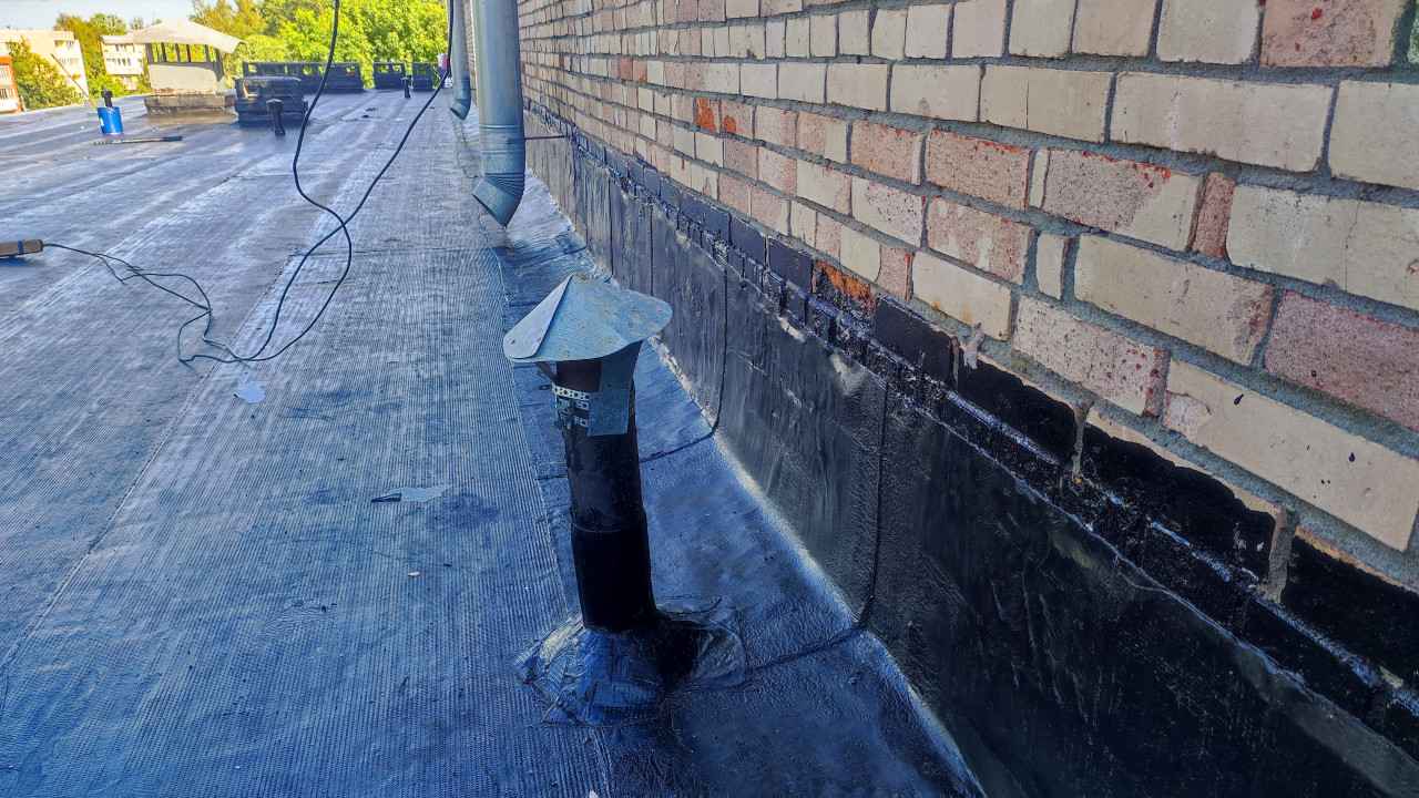 Снимок демонстрирует участок крыши с примыканием к кирпичной стене здания. На переднем плане виден вентиляционный выход с металлическим колпаком, закреплённый к поверхности рулонной кровли. Покрытие примыкает к стене, на которой видны следы строительных работ и гидроизоляции. На заднем плане заметны кирпичные конструкции, вентиляционные выходы и элементы крыши. Изображение подходит для использования в темах, связанных со строительством, гидроизоляцией и ремонтом крыш.