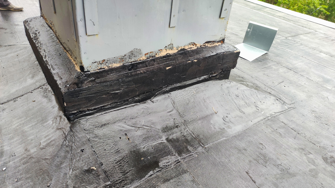 На фото изображена часть крыши многоквартирного дома с обработанным основанием вентиляционной шахты. На поверхности нанесен черный гидроизоляционный материал, укрепляющий стык конструкции и кровельного покрытия. Рядом лежит металлический уголок, предназначенный для монтажа. Сцена фиксирует элементы строительных работ и может быть использована в материалах о ремонте крыш, защите зданий и инженерных коммуникациях.