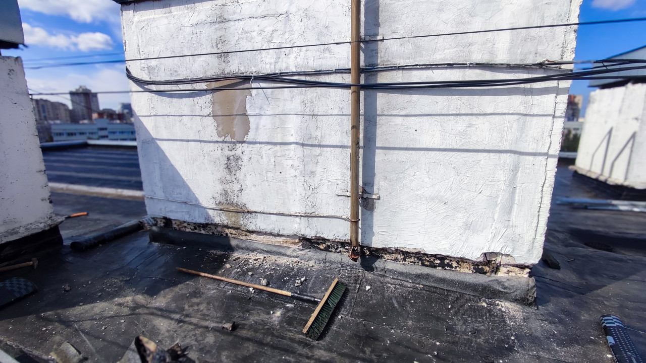 На фотографии изображена часть крыши многоэтажного здания с белой стеной технического блока, по которой проходят кабели и труба. У основания стены видны следы износа и грязь. На крыше лежит метла, использовавшаяся для уборки строительного мусора. На заднем плане виден городской пейзаж с жилыми домами. Снимок может быть использован для иллюстрации тем, связанных с эксплуатацией зданий, инженерией и обслуживанием кровли.