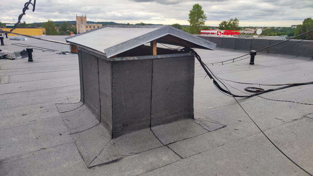 На фото изображен вентиляционный короб с двускатной металлической крышкой, установленный на плоской кровле. Конструкция обшита гидроизоляционным материалом темного цвета, к ней подведены кабели. На фоне виден горизонт с деревьями и городскими постройками, включая рекламные вывески. Снимок демонстрирует инженерные элементы кровли и особенности современного обслуживания зданий. Может применяться для материалов о строительстве и эксплуатации кровельных систем.