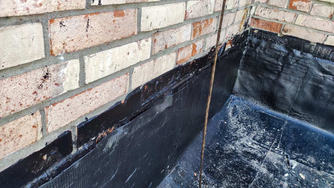 На фотографии крупным планом показан участок примыкания рулонной кровли к кирпичной стене. Видны обработанные битумной мастикой стыки, следы герметизации и крепления. Кирпичная кладка частично потемнела от использования мастики. Снимок фиксирует технические детали гидроизоляции и может быть использован для строительной документации и материалов по ремонту крыш.
