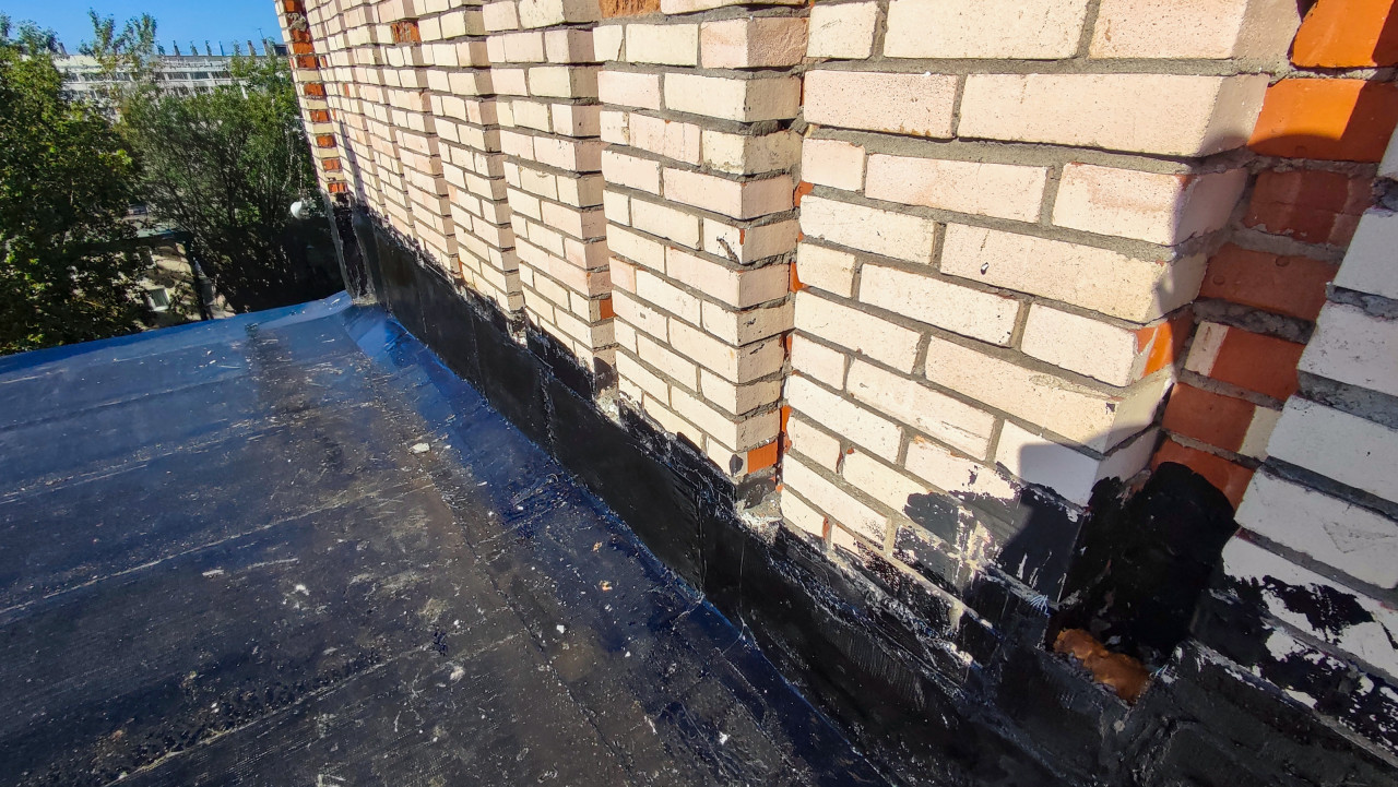 На изображении показан участок примыкания рулонной кровли к кирпичной стене многоэтажного здания. Нижняя часть кладки покрыта черным гидроизоляционным слоем, предотвращающим проникновение влаги. Кирпичная стена выполнена из красных и светлых кирпичей с выступающими рядами, что характерно для архитектурных решений советского периода. Кадр фиксирует этап работ по ремонту или модернизации крыши, важный для обеспечения долговечности конструкции. Фотографию можно применять в материалах по строительству и эксплуатации зданий.