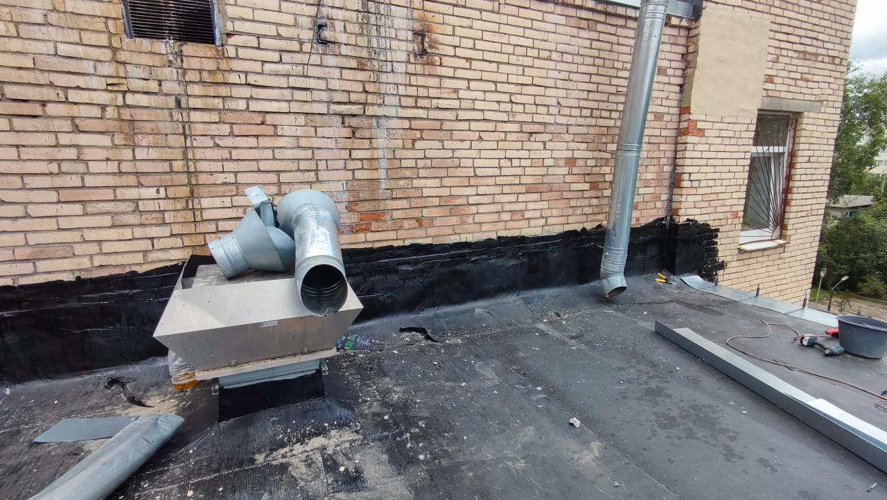 Фотография запечатлела участок крыши многоквартирного дома во время проведения ремонтных работ. На крыше уложено новое гидроизоляционное покрытие, рядом установлены металлические элементы вентиляционной системы и трубы водостока. На стене заметны следы влаги и потеков, указывающие на эксплуатационные особенности здания. Сцена иллюстрирует процесс ремонта кровли и подходит для использования в материалах о строительстве, инженерных коммуникациях и техническом обслуживании зданий.