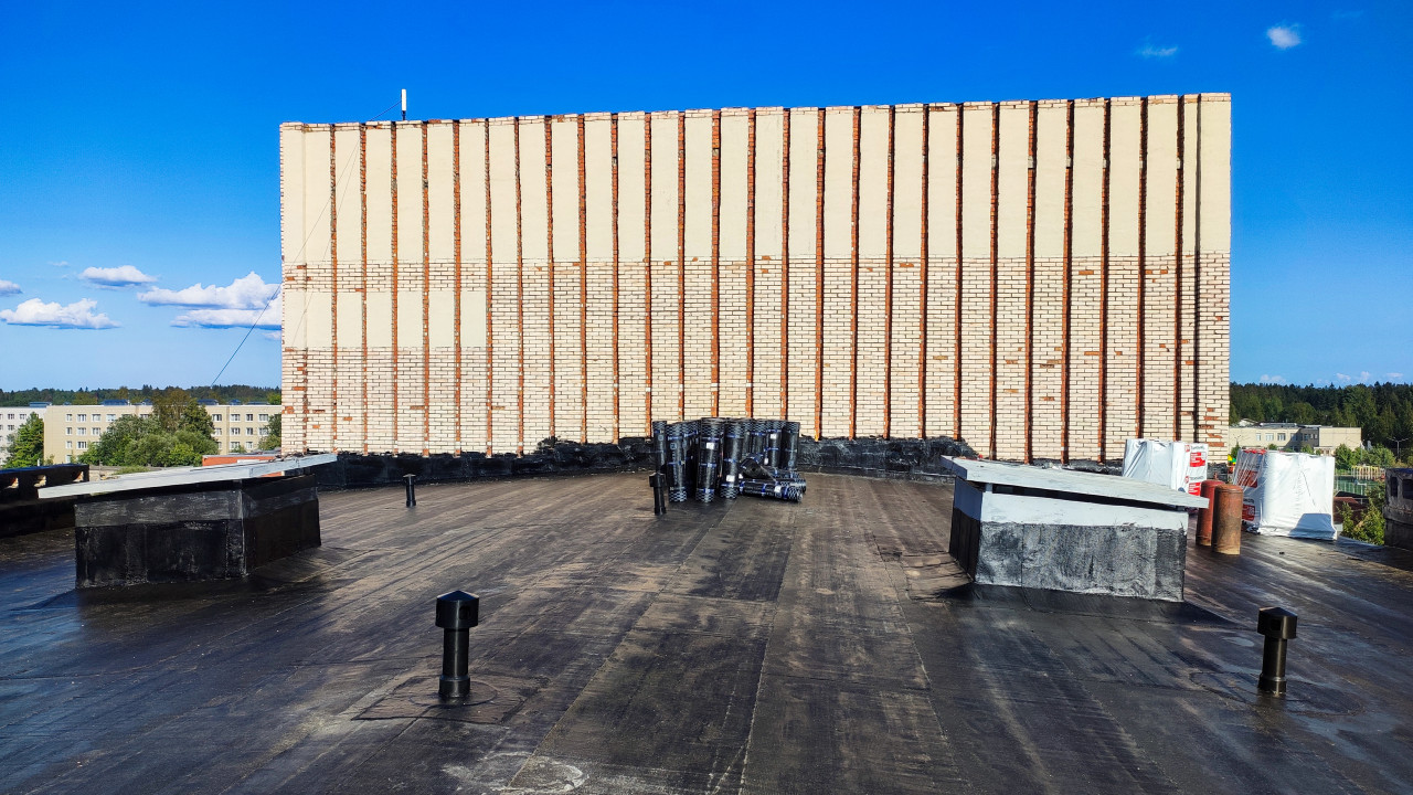 Фотография демонстрирует плоскую крышу многоэтажного здания, на поверхности которой видны установленные вентиляционные выходы и аэраторы. На фоне заметна кирпичная стенка шахты лифта или технического помещения, а также рулоны рулонного материала для ремонта. Видны жилые кварталы и зеленые насаждения за пределами здания. Снимок отражает процесс реконструкции или обслуживания кровельного покрытия. Материал подходит для публикаций о строительных технологиях, ремонте и эксплуатации многоквартирных домов.