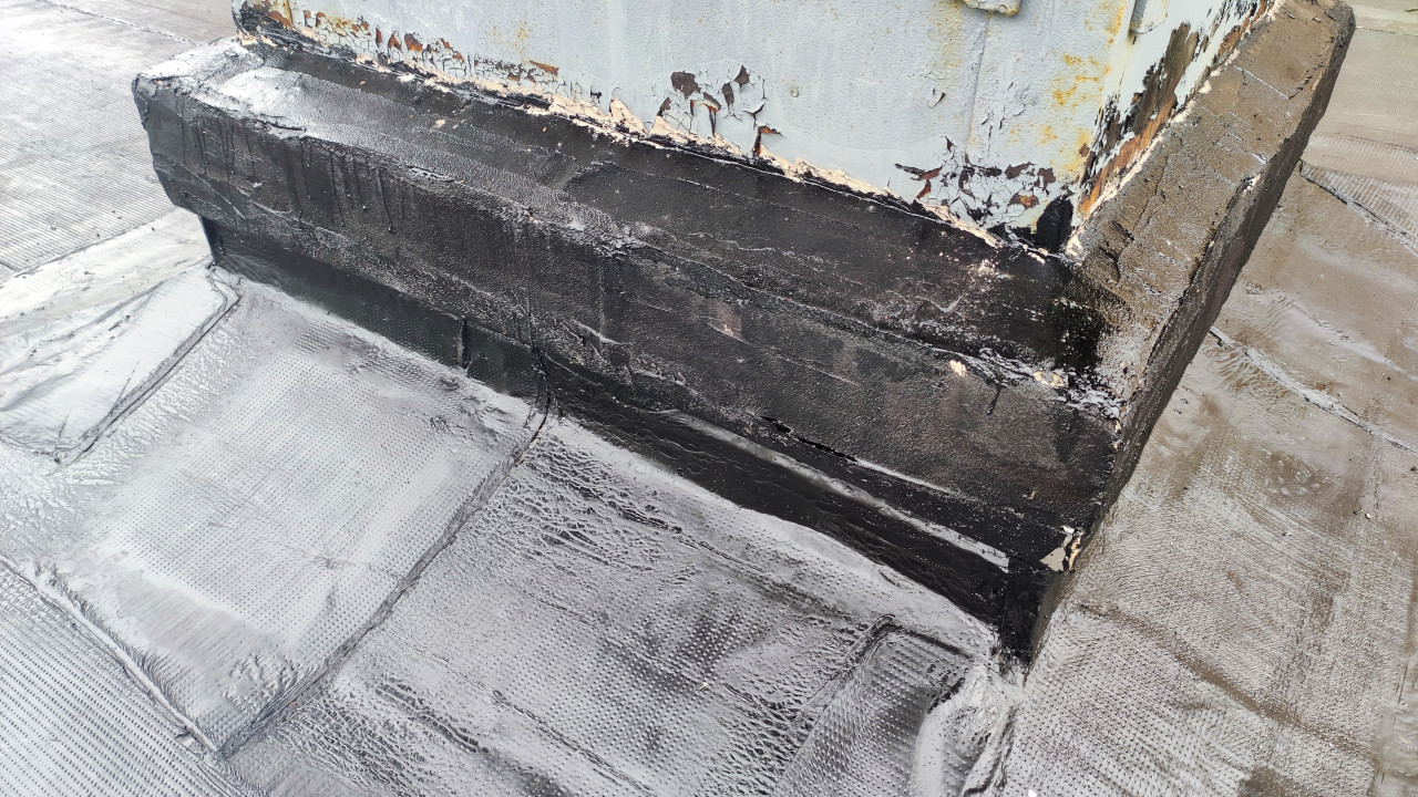 На фотографии показан фрагмент кровли промышленного здания с узлом примыкания к вертикальной стене. Видно, что стык обработан битумной мастикой и гидроизоляционными материалами, поверх которых нанесено защитное покрытие. Стена имеет следы коррозии и отслоившейся краски. Снимок демонстрирует процесс и результат ремонтных работ на плоской кровле, направленных на герметизацию стыков для защиты здания от протечек. Такое фото может использоваться в материалах о строительстве, ремонте и техническом обслуживании зданий.