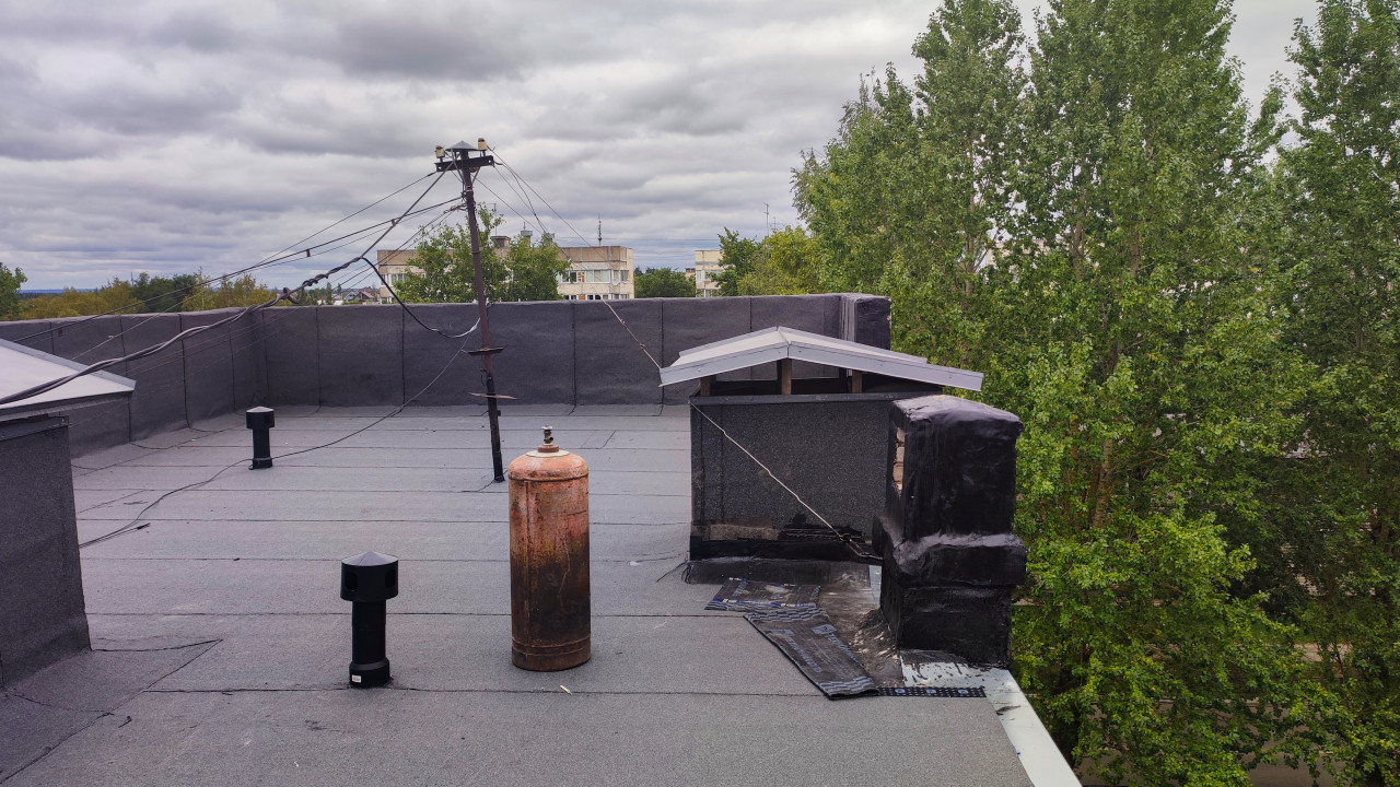 На фотографии изображена плоская кровля здания с уложенным рулонным материалом. В кадре заметны вентиляционные выходы, металлический газовый баллон, а также опора с проводами, идущими через крышу. На заднем плане видны зеленые деревья и часть многоэтажной застройки. Фото фиксирует состояние крыши после ремонтных работ и показывает инженерные элементы, необходимые для эксплуатации здания. Снимок может использоваться в материалах о строительстве, техническом обслуживании и безопасности зданий.
