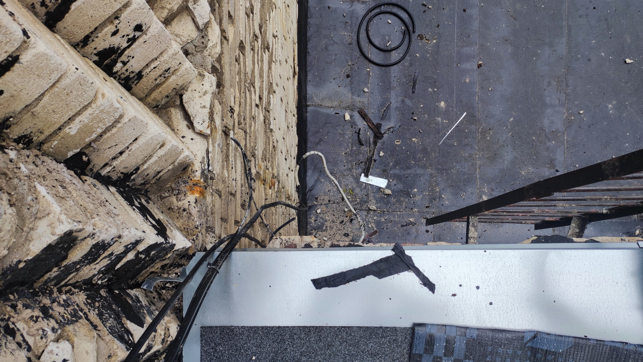 Фотография сделана с крыши здания и направлена вниз, фиксируя кирпичную стену с выступами и часть асфальтированной площадки внизу. На стене видны кабели и следы старой гидроизоляции, на крыше — мусор, обломки материалов и фрагменты проводки. Кадр передает техническое состояние объекта, показывает детали старых инженерных коммуникаций и элементы разрушений. Такой снимок можно использовать для материалов о ремонте, обследовании зданий и демонстрации эксплуатационных проблем.