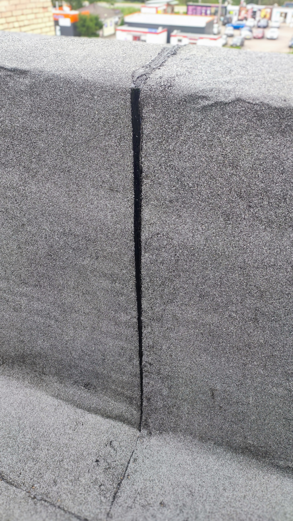 Фотография фиксирует вертикальный стык на парапете крыши, обработанный герметизирующим материалом. Видна структура рулонного покрытия, защищающего конструкцию от влаги и атмосферных воздействий. В верхней части кадра заметны городские постройки и автомобили на парковке. Снимок демонстрирует детали ремонта кровельных конструкций и может быть использован в публикациях, посвященных строительству, обслуживанию и техническому контролю зданий.