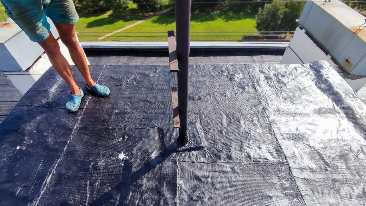 На фотографии изображена часть крыши жилого дома, покрытой рулонным материалом. На переднем плане видны ноги человека в шортах и обуви, стоящего рядом с металлической трубой с закрепленными элементами. На заднем плане заметен зеленый газон и деревья. Снимок отражает процесс проверки или ремонта крыши и может быть использован в темах, связанных со строительством, техническим обслуживанием и кровельными работами.