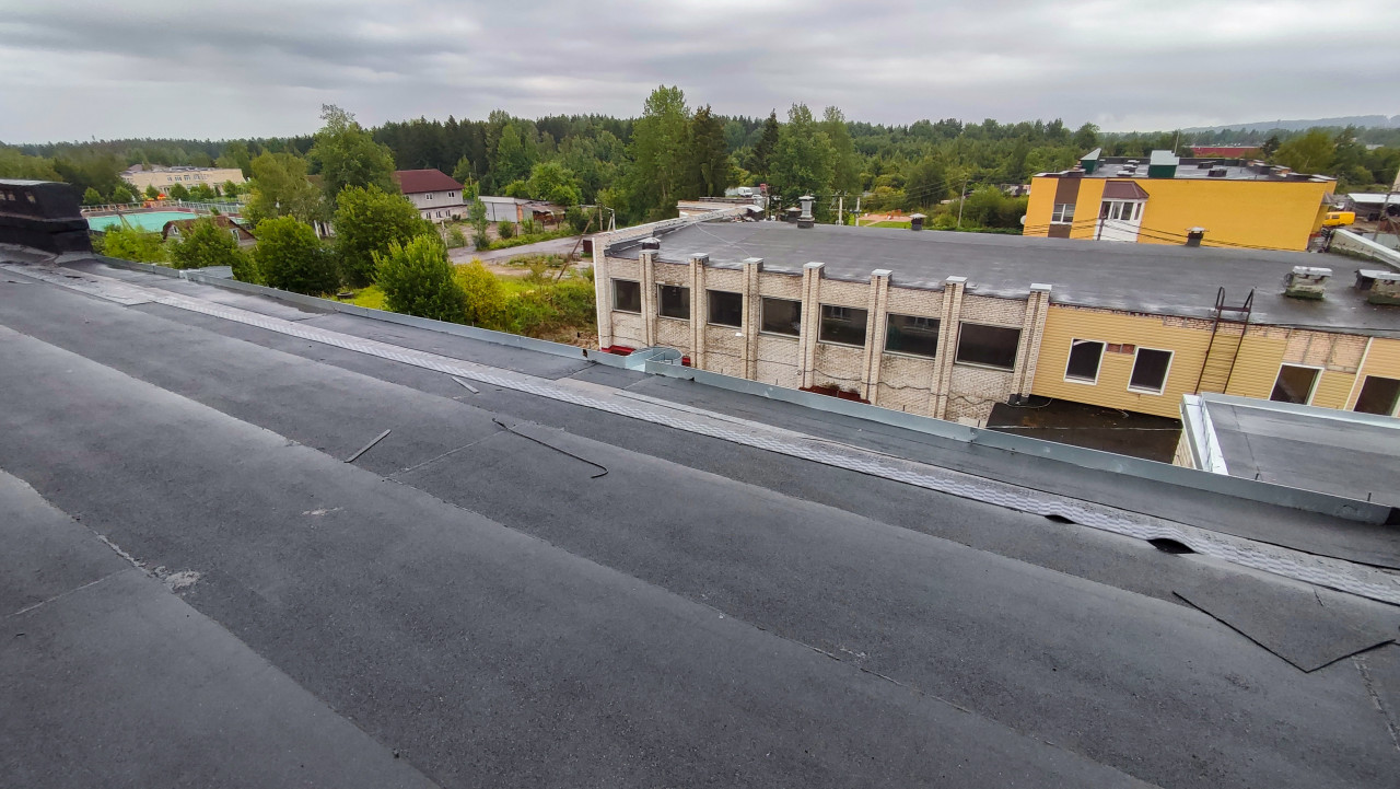 Снимок сделан с крыши, покрытой рулонным материалом, на поверхности которой заметны следы строительных работ и уложенные полосы гидроизоляции. На заднем плане видны здания из кирпича и панелей, в том числе желтое здание с пластиковыми окнами и светлый корпус с характерными вертикальными элементами. За застройкой просматривается лесополоса. Фотография может использоваться в темах, связанных с эксплуатацией городских зданий, ремонтом крыш и архитектурой промышленных районов.