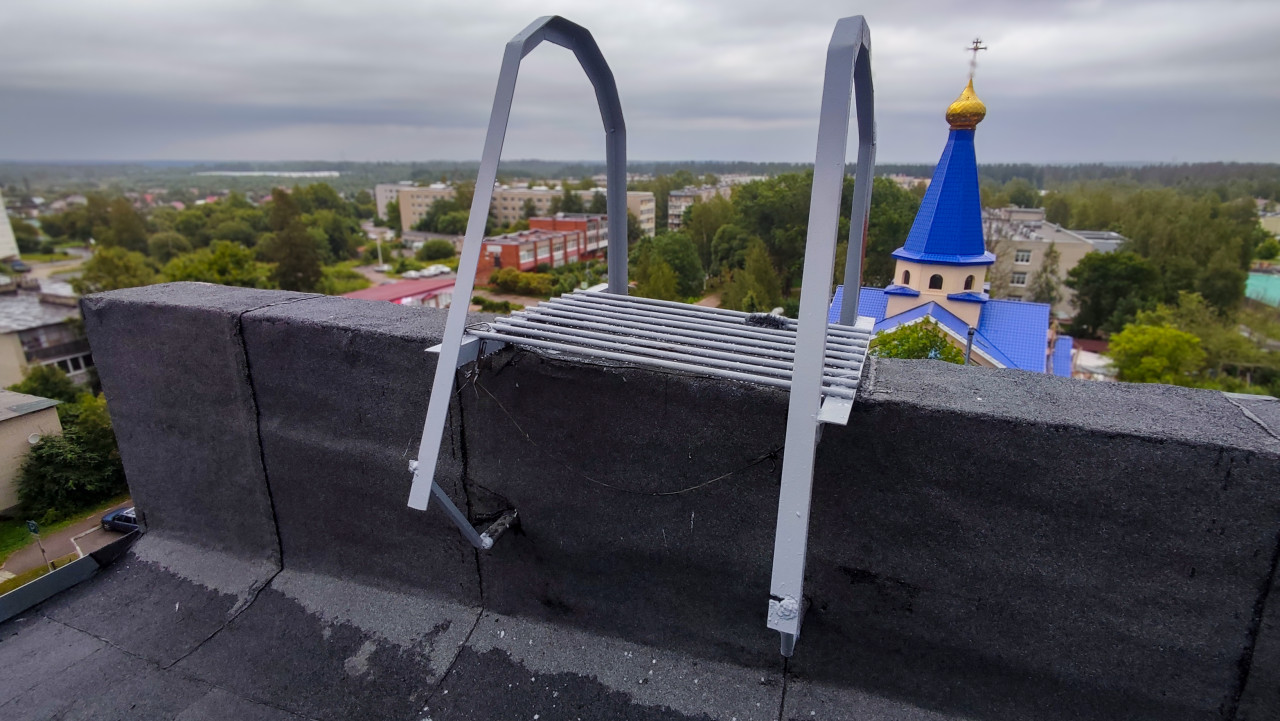 На снимке изображена плоская рулонная кровля с установленной металлической переходной лестницей, закрепленной на парапете крыши. Лестница окрашена в серый цвет и предназначена для безопасного перемещения обслуживающего персонала. На заднем плане виднеется купол и синий шатровый верх православного храма с золотым крестом, что указывает на съемку в городской среде с культурно значимыми объектами. Храмовые постройки традиционно имеют архитектурную ценность и являются важными ориентирами в городской панораме.