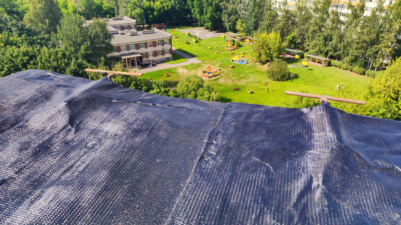 крыша ремонт крыши крыша здания износ кровельные работы ремонт кровли повреждения крыши кровля кровельное покрытие крыша дома рулонное покрытие плоская крыша монтаж металлическая перекладина жилой дом многоквартирный дом двор детская площадка деревья благоустройство городская среда городская застройка зеленая зона жилые кварталы архитектура обслуживание зданий ремонтные работы инженерные системы кровельные материалы жилой массив панельный дом типовая застройка ремонтПохожие фотографии