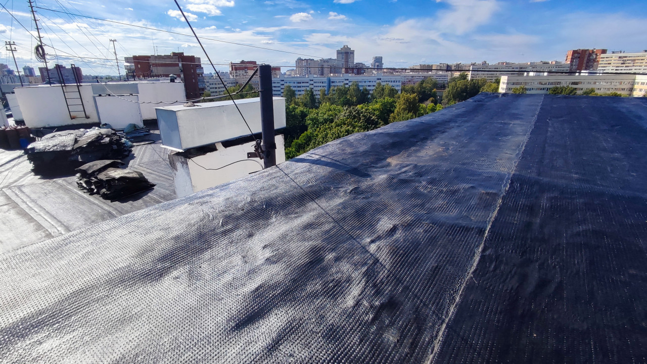 Крыша жилого дома с рулонным покрытием и строительными отходами