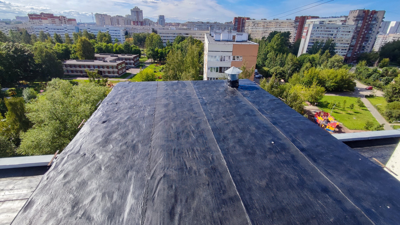 Плоская крыша жилого дома после ремонта рулонным материалом