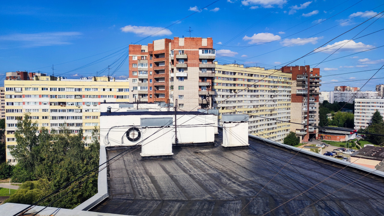 Фотография запечатлела плоскую крышу жилого здания, покрытую рулонным материалом после ремонта. На крыше видны инженерные блоки с закрепленными кабелями и катушкой провода. На заднем плане — многоквартирные дома советской и постсоветской застройки, характерные для российских городов. Снимок иллюстрирует городскую архитектуру, эксплуатацию жилого фонда и может использоваться для материалов о строительстве и инженерных системах.
