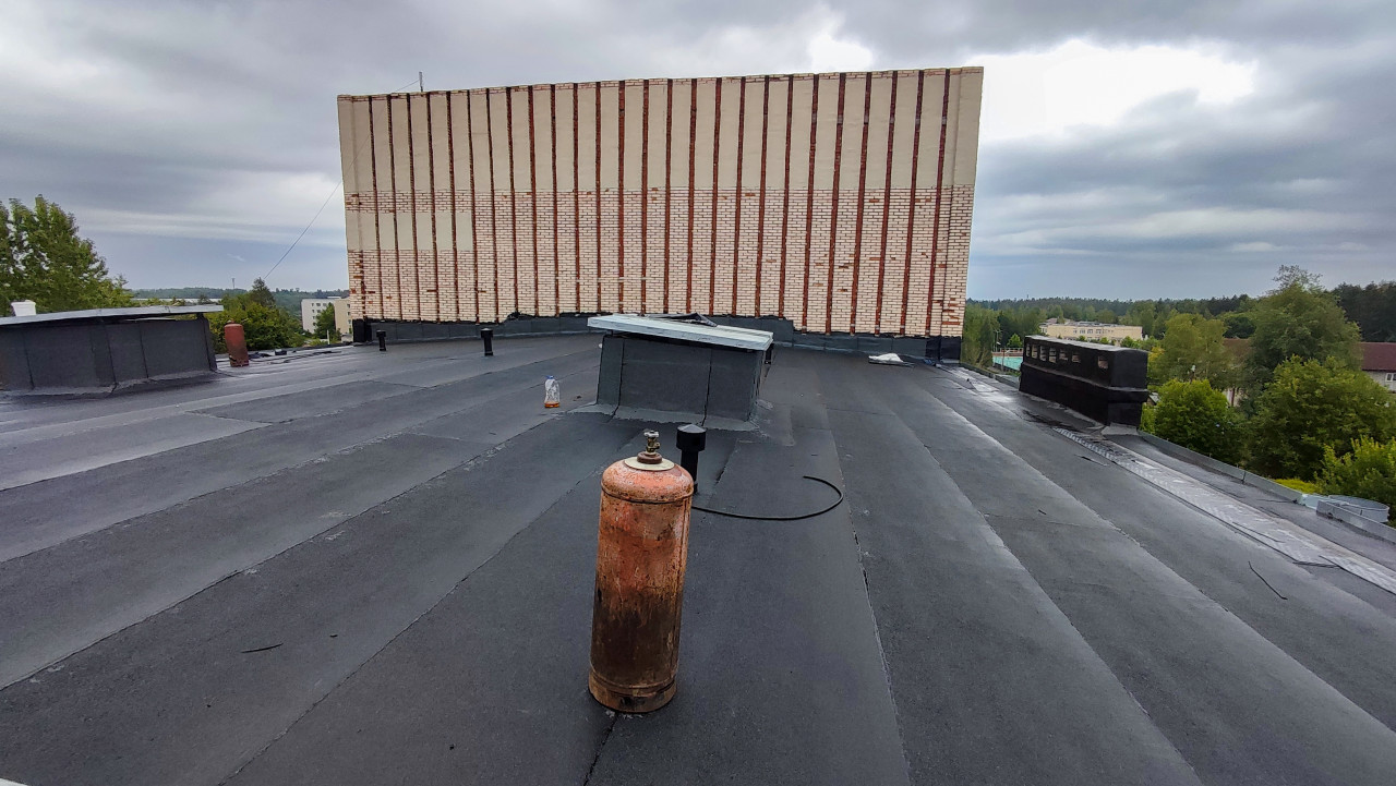 На фотографии показана плоская крыша, покрытая рулонным материалом, с установленным газовым баллоном для проведения ремонтных работ. В центре и на заднем плане расположены вентиляционные шахты. Вдалеке видна высокая кирпичная стена с вертикальным декоративным оформлением, характерная для промышленных или общественных зданий советского времени. На горизонте заметна городская и лесная застройка. Снимок можно использовать для иллюстрации строительных и ремонтных работ, эксплуатации крыш и архитектурных особенностей зданий.