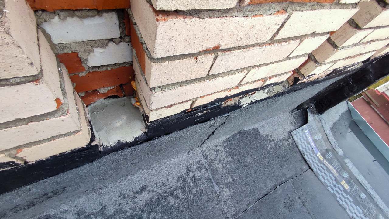 На фотографии крупным планом показан участок кирпичной стены светлого и красного оттенка с заметными дефектами кладки и штукатурки. В нижней части видна рулонная кровля с герметизацией и мастикой, примененной для защиты стыков. Фотография может быть использована для иллюстрации состояния фасадов, ремонта кровельных стыков, а также примыканий кровли к стене.
