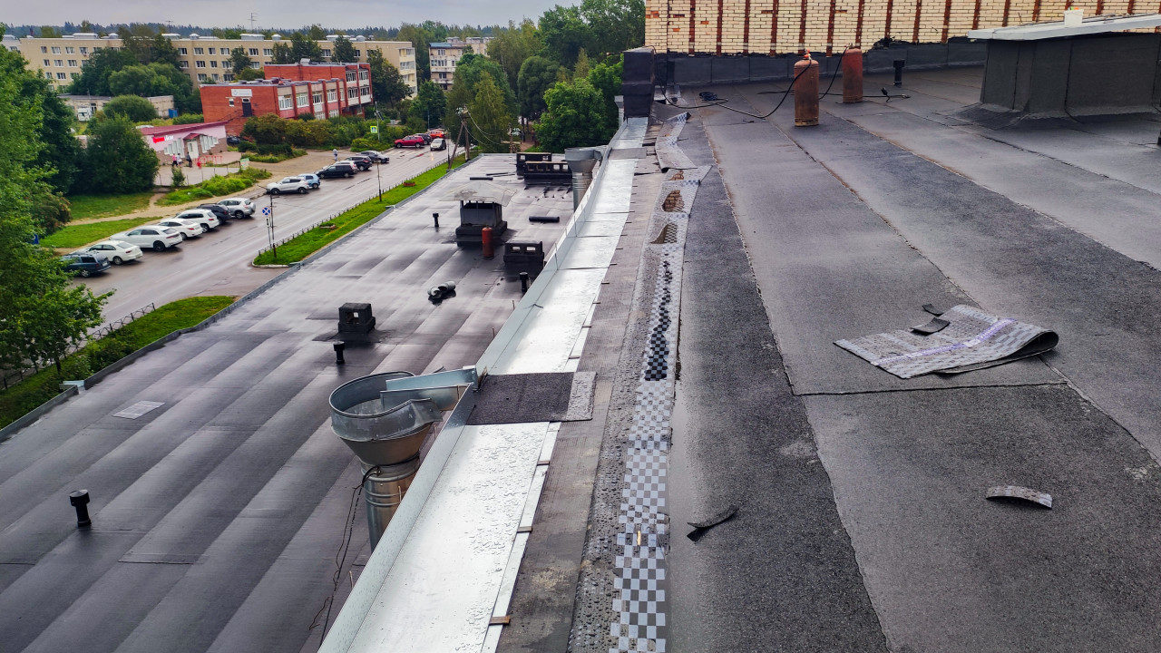 крыша ремонт крыши крыша здания износ кровельные работы ремонт кровли повреждения крыши кровля кровельное покрытие крыша дома плоская крыша рулонное покрытие газовые баллоны вентиляционные выходы металлический желоб дренажная система строительные работы кровельные материалы инженерные системы крыша после ремонта городской пейзаж жилые дома социальные здания кирпичное здание парковка автомобили урбанистика городская среда архитектура района эксплуатация зданий строительные технологии инженерные коммуникации придомовая территория фасад здания ремонтные работы рулонный материалПохожие фотографии