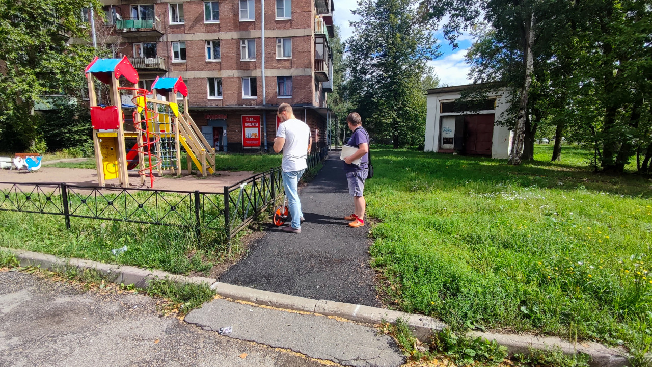 На фото изображены двое мужчин, выполняющих замеры асфальтового покрытия возле детской площадки. Один из них использует измерительное колесо, другой ведет записи. На переднем плане видно игровое оборудование с горкой и лестницами, огороженное невысоким металлическим забором. На заднем плане расположен кирпичный жилой дом и хозяйственное строение. Снимок отражает обследование придомовой территории.