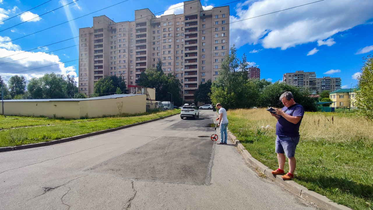 асфальт дорога замеры измерительное колесо курвиметр инженерные работы контроль качества обследование технический контроль дорожное покрытие инженер специалист ремонт дорог придомовая территория двор автомобили парковка жилой дом многоэтажка панельный дом архитектура благоустройство инфраструктура тротуар бордюр проезжая часть обследование территории жилой квартал застройка жилье город улицаПохожие фотографии