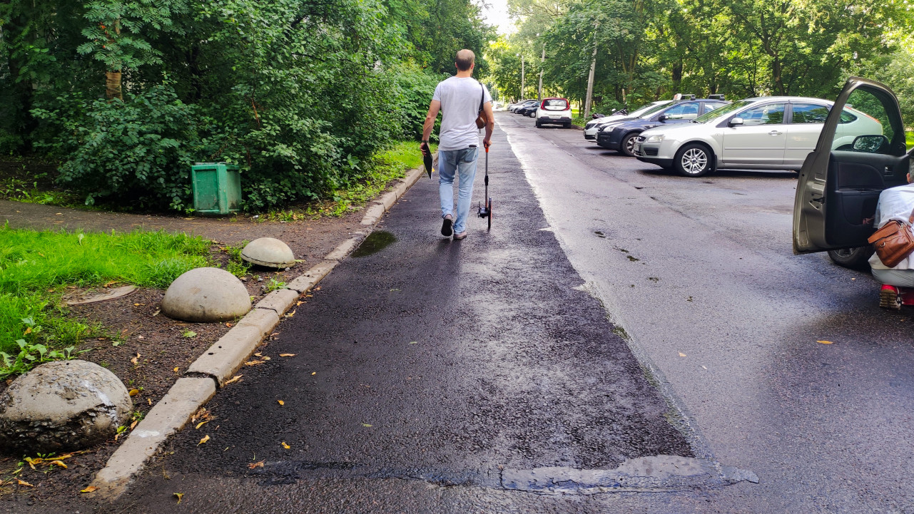 асфальт дорога замеры измерительное колесо курвиметр инженерные работы контроль качества обследование технический контроль заплатки ремонт дороги придомовая территория двор автомобили парковка газон кустарники деревья бетонные полусферы жилой квартал дорожные работы городская среда реконструкция дороги обследование дорожного полотна инспекция придомовой участокПохожие фотографии