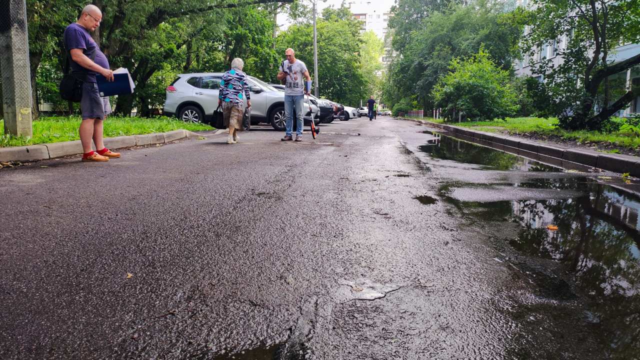 На фотографии изображен участок дворовой дороги с неровным асфальтовым покрытием, на котором скопилась вода после дождя. Несколько человек проводят обследование состояния дорожного полотна, один держит измерительное колесо, другой фиксирует данные. Вдоль дороги стоят припаркованные автомобили, слева и справа видны деревья и газон.