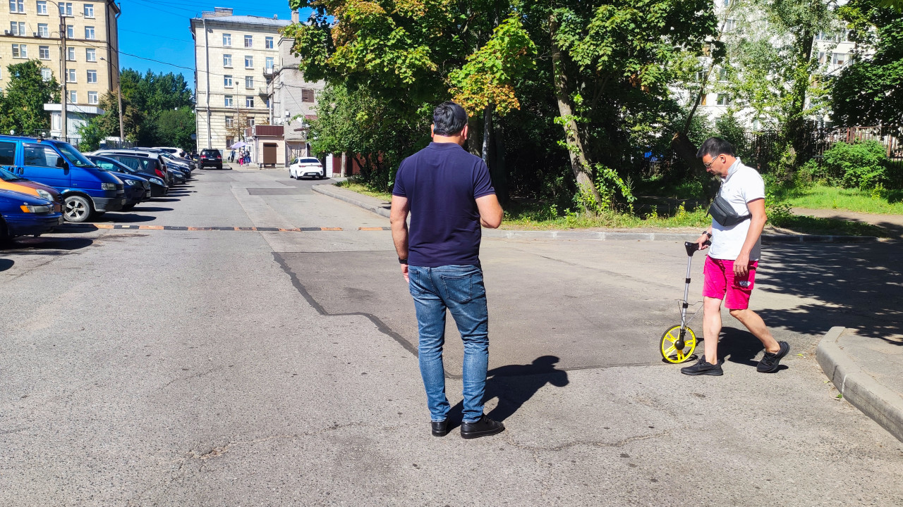 асфальт дорога замеры измерительное колесо курвиметр инженерные работы контроль качества обследование технический контроль замер измерение дорожные измерения придомовая территория жилой квартал автомобили транспорт пешеходы измерительное оборудование строительные работы дворовая дорога многоквартирный дом придомовой участок городская среда благоустройство уличные работы жилые здания техника инженер оборудование дорожный контроль городская инфраструктураПохожие фотографии